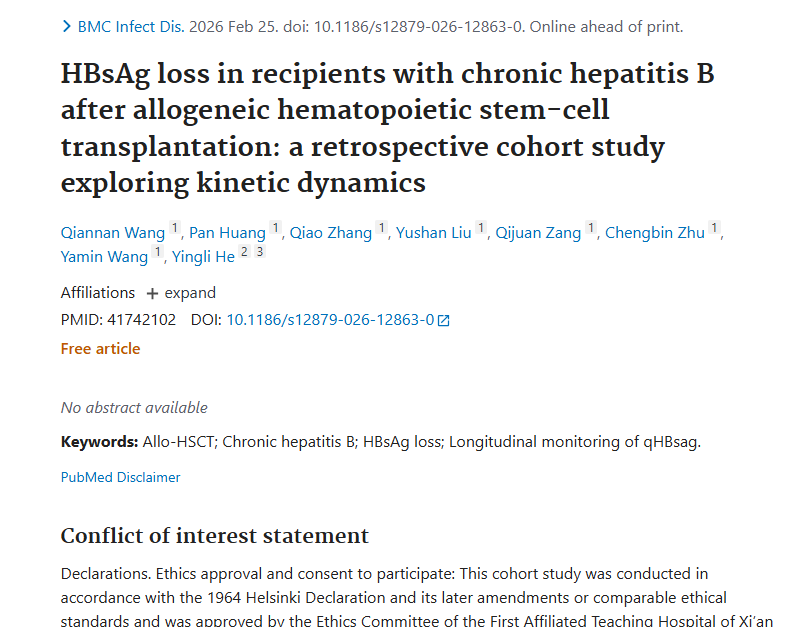 Recently, Professor He Yingli’s team from the Department of Infectious Diseases at the First Affiliated Hospital (FAH) of Xi’an Jiaotong University (XJTU) published the results of a retrospective cohort study in the international journal BMC Infectious Diseases, entitled “HBsAg loss in recipients with chronic hepatitis B after allog...