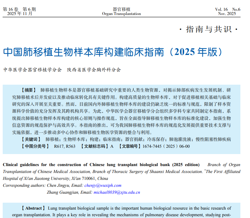 Recently, the Clinical Guidelines for the Construction of Chinese Lung Transplant Biological Bank (2025 Edition) (hereinafter referred to as the “Guidelines”) were officially released in the journal Organ Transplantation. These guidelines were initiated by the Branch of Organ Transplantation of Chinese Medical Association and the Bra...
