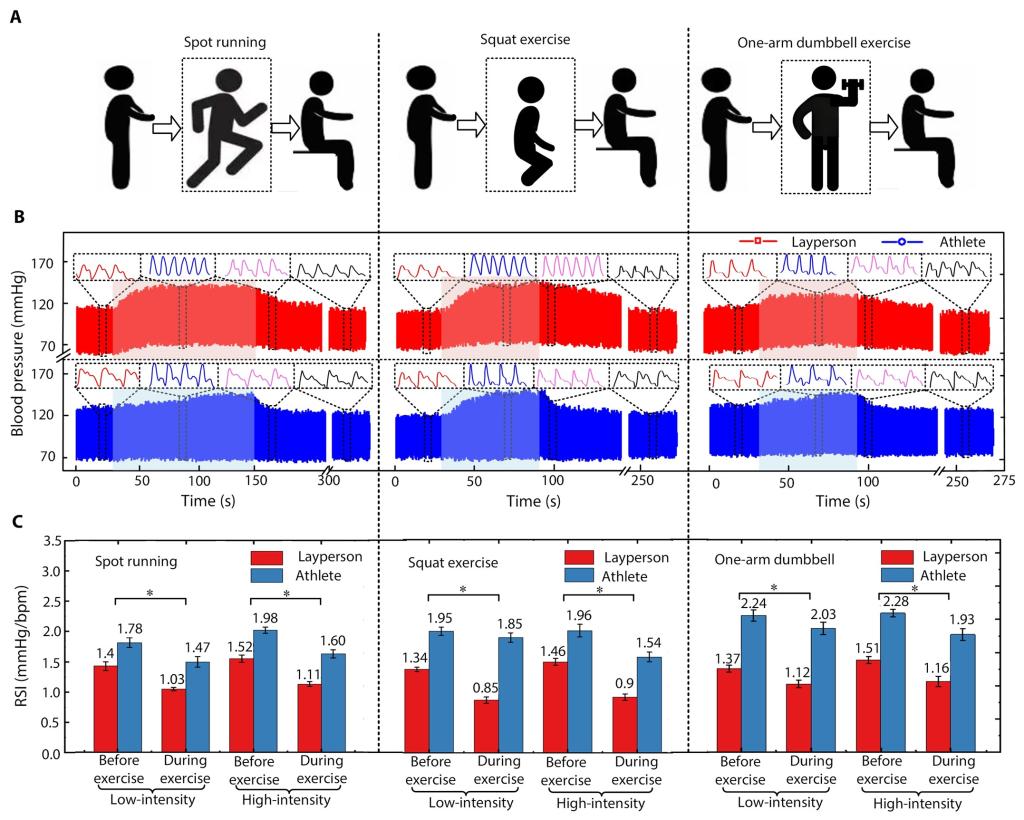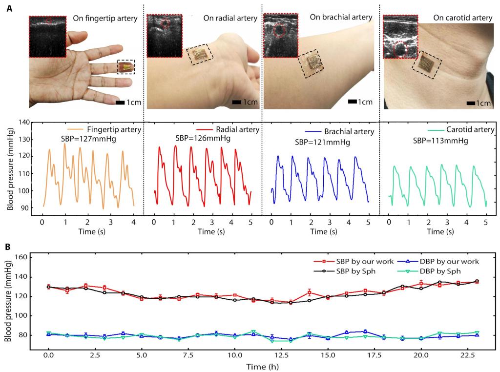 In terms of applications, the array enables real-time, continuous BP monitoring at multiple sites. In 24-hour monitoring, the systolic and diastolic pressure errors were 1.8 mmHg and 1.1 mmHg, respectively, across a measurement range of 10-350 mmHg, achieving performance comparable to commercial sphygmomanometers. It can also simultaneously monitor BP and heart rate during physical activity (heart rate error ±2 bpm), differentiate cardiac function using the reverse shock index, and diagnose latent cardiovascular disease. Furthermore, it measures vascular stiffness with an error margin of less than 25%, validated in clinical settings.