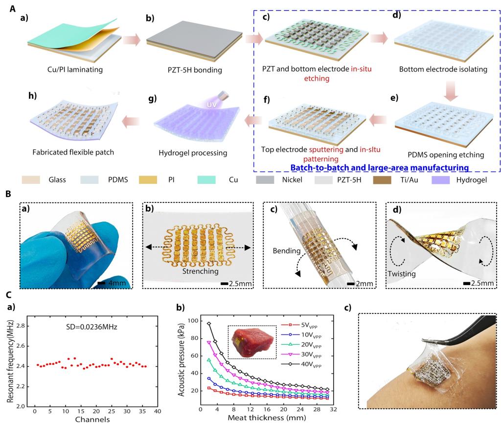 To address the challenges of poor consistency and difficulty in mass production of flexible ultrasound devices, the team developed a MEMS-compatible fabrication technology. By employing processes such as magnetron sputtering for electrode deposition and femtosecond laser etching for piezoelectric units, manual operation was reduced and device consistency improved. In addition, a UV light–cured hydrogel layer was introduced to enhance acoustic impedance matching and adhesion. The fabricated 6×6 array has a center frequency of 2.4 MHz, with a resonance frequency standard deviation of less than 1.0%, penetration depth exceeding 30 mm, and is suitable for cost-effective mass production.