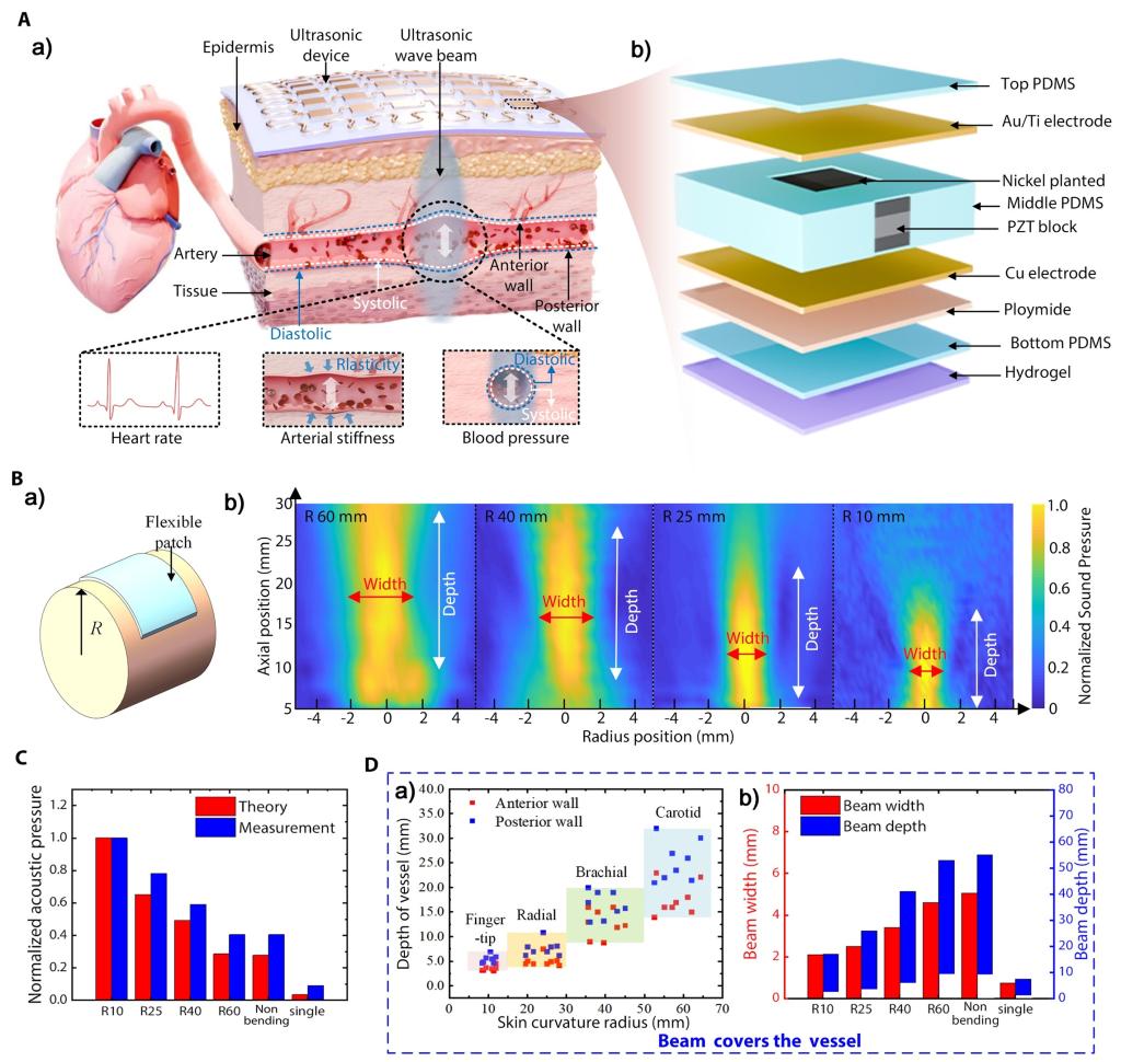 A research team led by Academician Jiang Zhuangde of the Chinese Academy of Engineering and professor at the School of Mechanical Engineering, Xi’an Jiaotong University (XJTU), and Professor Lyu Yi of the First Affiliated Hospital (FAH) of XJTU, co-developed a skin-adaptive focused flexible ultrasonic transducers with microelectromechanical systems (MEMS)-compatible processes. The device conformally adhered to the skin surface and enables noninvasive, real-time, continuous monitoring of multiple hemodynamic parameters, such as blood pressure (BP) waveform, heart rate, and vascular stiffness. The study introduced the skin-adaptive focusing ultrasound (SAFU) method. By leveraging in-phase excitation of full-array elements together with the natural curvature of the skin, the method generated a “football-shaped” acoustic beam that dynamically adjusted to skin curvature and covered typical arterial regions such as digital arteries and the radial artery, enabling high-precision measurement of hemodynamic parameters. The approach greatly simplified the structural and circuit complexity of phased-array technology, enhanced acoustic pressure by 10.8 times, and improved the signal-to-noise ratio by 19.5 dB, offering an ideal pathway for physiological parameter monitoring applications based on ultrasound time-of-flight measurement.