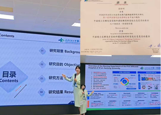 At the invitation of the conference, Li Rong and Luo Yaqi from the Department of Radiation Oncology of the First Affiliated Hospital (FAH) of Xi’an Jiaotong University (XJTU) traveled to Macau to attend the symposium and delivered a presentation titled “Chinese Nurses’ Perspectives on Family Information Needs During the Transition to Home-Based End-of-Life Care”. Drawing on nursing practice and research findings, the presentation analyzed the characteristics and cultural sensitivities of families’ information needs during the transition to hospice care, and examined the vital role of nurses in information identification, communication and coordination, and humanistic companionship, garnering attention and active discussion from participating experts.