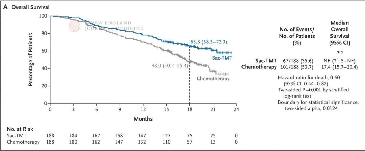 The results showed that PFS in the sac-TMT group was significantly superior to that in the chemotherapy group (Figure 1). The prespecified interim analysis of OS also met the positive threshold, with median OS not reached in the sac-TMT group versus 17.4 months in the chemotherapy group (HR, 0.60; two-sided P=0.001) (Figure 2). For objective response rate (ORR), the sac-TMT group achieved 60.6% versus 43.1% in the chemotherapy group; median duration of response (DoR) was 8.3 months and 4.2 months, respectively. The vast majority of prespecified subgroups, including patients who had received first- or second-line third-generation TKIs and those with brain or liver metastases, showed consistent trends of benefit.