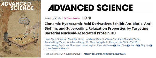 Recently, a research team led by Professor Liu Bing from the First Affiliated Hospital (FAH) of Xi’an Jiaotong University (XJTU) published their findings as a cover article in Advanced Science, proposing a completely new strategy for antibiotic R&D. By drawing on the natural antibacterial mechanisms of bacteriophages, they successfully developed small-molecule candidate drugs targeting bacterial nucleoid-associated protein HU, cinnamic-hydroxamic-acid derivatives (CHADs), opening up a new pathway to address the global challenge of antibiotic resistance.