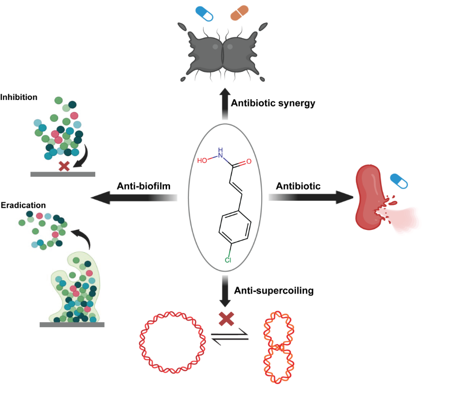 The study demonstrated that CHADs directly inhibit the binding of HU to DNA, thereby disrupting the three-dimensional architecture of the bacterial genome and exhibiting a distinct “structural bactericidal” mode of action. At the same time, they reduce DNA supercoiling in a non-topoisomerase-dependent manner, reprogram bacterial gene pathways and weaken the ability of bacteria to adapt to environmental stresses. In addition, CHADs can inhibit biofilm formation and disrupt mature biofilm structures, and they are much less likely to induce resistance, with a resistance frequency as low as ~10-10, markedly outperforming traditional antibiotics.
