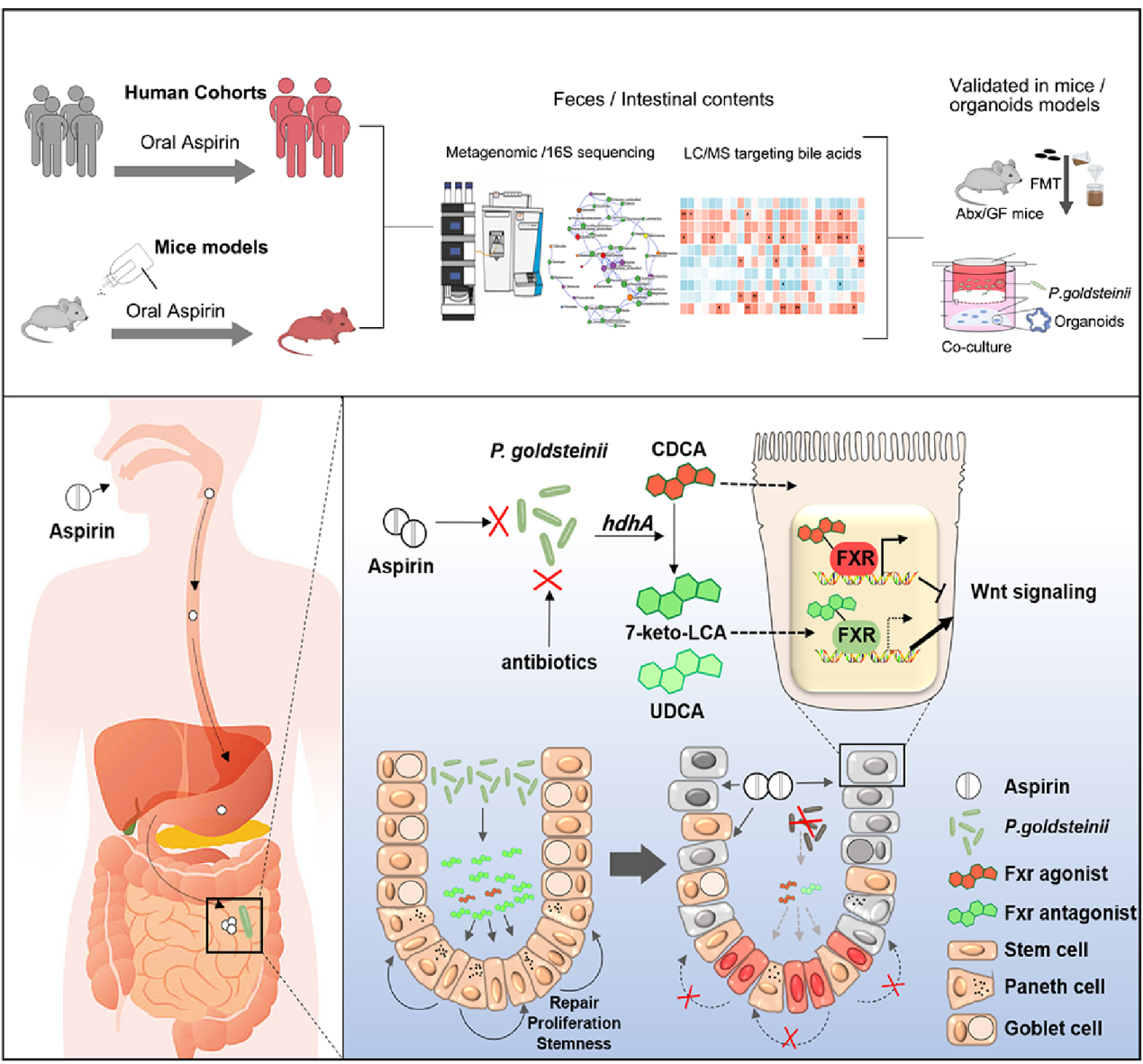 This study was jointly completed by Professors Yuan Zuyi and Wu Yue from the FAH of XJTU in collaboration with Professor Frank J. Gonzalez from the U.S. National Institute of Medicine. By integrating multi-omics data from clinical cohorts with animal trials, the team, for the first time, revealed the key protective role of the “gut microbiota-bile acid axis” in aspirin-related intestinal injury, and identified Parabacteroides goldsteinii (P. distasonis), which is inhibited by aspirin, and its metabolite 7-keto-lithocholic acid (7-keto-LCA). The latter promotes intestinal stem cell renewal and epithelial repair by inhibiting FXR signaling and activating Wnt signaling. Supplementation with P. distasonis alleviated intestinal barrier injury in mice, providing a new microbial-metabolic intervention strategy for the prevention and treatment of aspirin-related enteropathy.