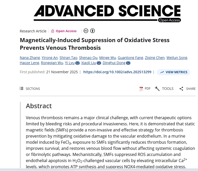 To address this clinical challenge, the Surgical DreamWorks team of the First Affiliated Hospital (FAH) of Xi’an Jiaotong University (XJTU) recently published a research article entitled “Magnetically-Induced Suppression of Oxidative Stress Prevents Venous Thrombosis” in the journal Advanced Science. The study, for the first time, systematically demonstrated that static magnetic fields (SMF) can effectively prevent venous thrombosis by inhibiting oxidative stress and protecting vascular endothelial cells. This breakthrough not only expands the scientific research frontier on the biological effects of magnetic fields, but also provides a completely new non-pharmacological, noninvasive strategy for the prevention of venous thrombosis.