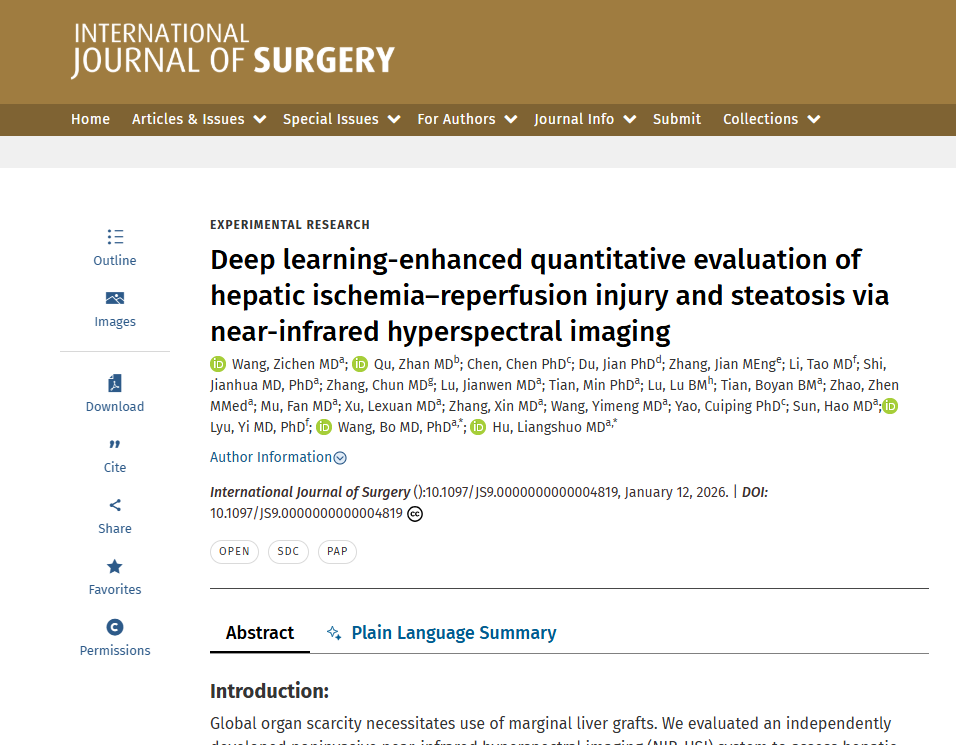 Recently, the hepatobiliary surgery team at the First Affiliated Hospital (FAH) of Xi’an Jiaotong University (XJTU), led by Associate Chief Physician Hu Liangshuo and Professor Wang Bo, published a significant research finding in International Journal of Surgery (Impact Factor: 10.3). The team pioneered the integration of near-infrared hyperspectral imaging with deep learning, establishing a novel intelligent evaluation system for donor livers in liver transplantation and providing an innovative solution to the longstanding clinical challenges in donor liver assessment. Doctoral candidate Wang Zichen is the first author, and Wang Bo and Hu Liangshuo serve as co-corresponding authors.